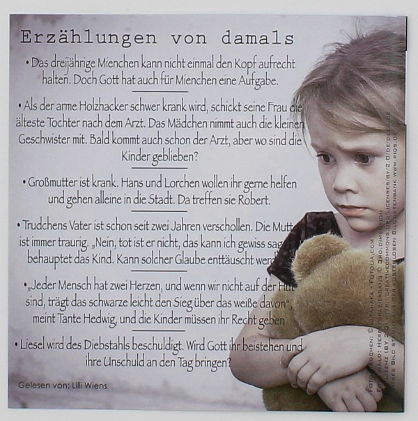 Das Krüppel-Mienchen – Das dreijährige Mienchen kann nicht einmal den Kopf aufrecht halten. Doch Gott hat auch für Mienchen eine Aufgabe. • Die Kinder im Walde – Als der arme Holzhacker schwer krank wird, schickt seine Frau die älteste Tochter nach dem Arzt. Das Mädchen nimmt auch die kleinen Geschwister mit. Bald kommt auch schon der Arzt, aber wo sind die Kinder geblieben? • Es geht durch alle Lande – Großmutter ist krank. Hans und Lorchen wollen ihr gerne helfen und gehen alleine in die Stadt. Da treffen sie Robert. • Gott hilft – Trudchens Vater ist schon seit zwei Jahren verschollen. Die Mutter ist immer traurig. „Nein, tot ist er nicht, das kann ich gewiss sagen“, behauptet das Kind. Kann solcher Glaube enttäuscht werden? • Vom schwarzen und weißen Herzen – „Jeder Mensch hat zwei Herzen, und wenn wir nicht auf der Hut sind, trägt das schwarze leicht den Sieg über das weiße davon“, meint Tante Hedwig, und die Kinder müssen ihr Recht geben • Liesel die Holzsammlerin – Liesel wird des Diebstahls beschuldigt. Wird Gott ihr beistehen und ihre Unschuld an den Tag bringen? Sechs Erzählungen aus dem gleichnamigen Buch.